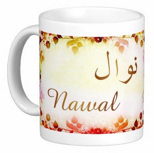 Mug avec le prénom "Nawal" écrit en français, en arabe (نوال) et calligraphié de façon artistique en arabe sur la partie droite.