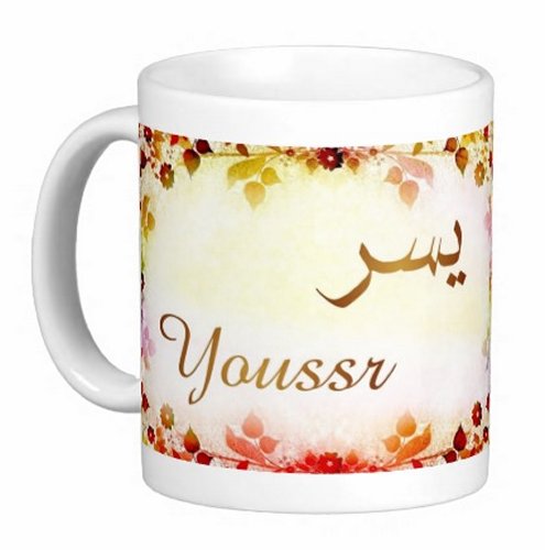 Mug avec le prénom "Yousr" écrit en français, en arabe (يسر) et calligraphié de façon artistique en arabe sur la partie droite.
