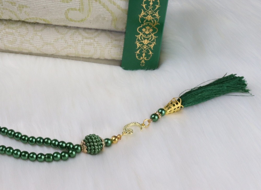 Sabha (Chapelet) 99 perles de couleur vert avec motifs dorés - REF. 25955 (3.90 €)