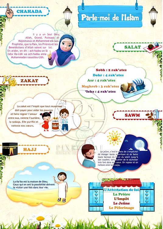 Ce poster présente de manière originale ludique et attractive les cinq piliers de l'Islam, comme traités dans la série des cinq livres de "Parle-moi de l'Islam".