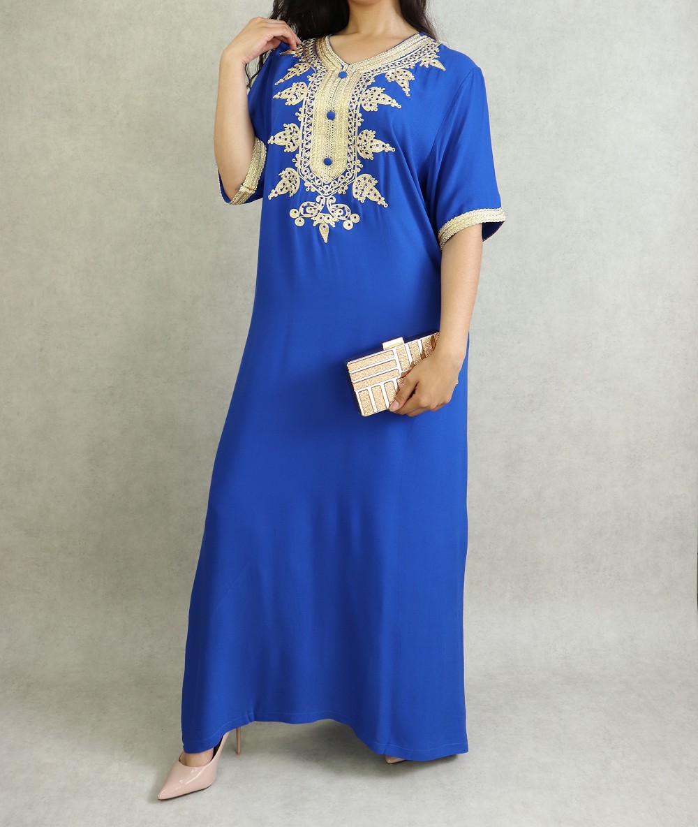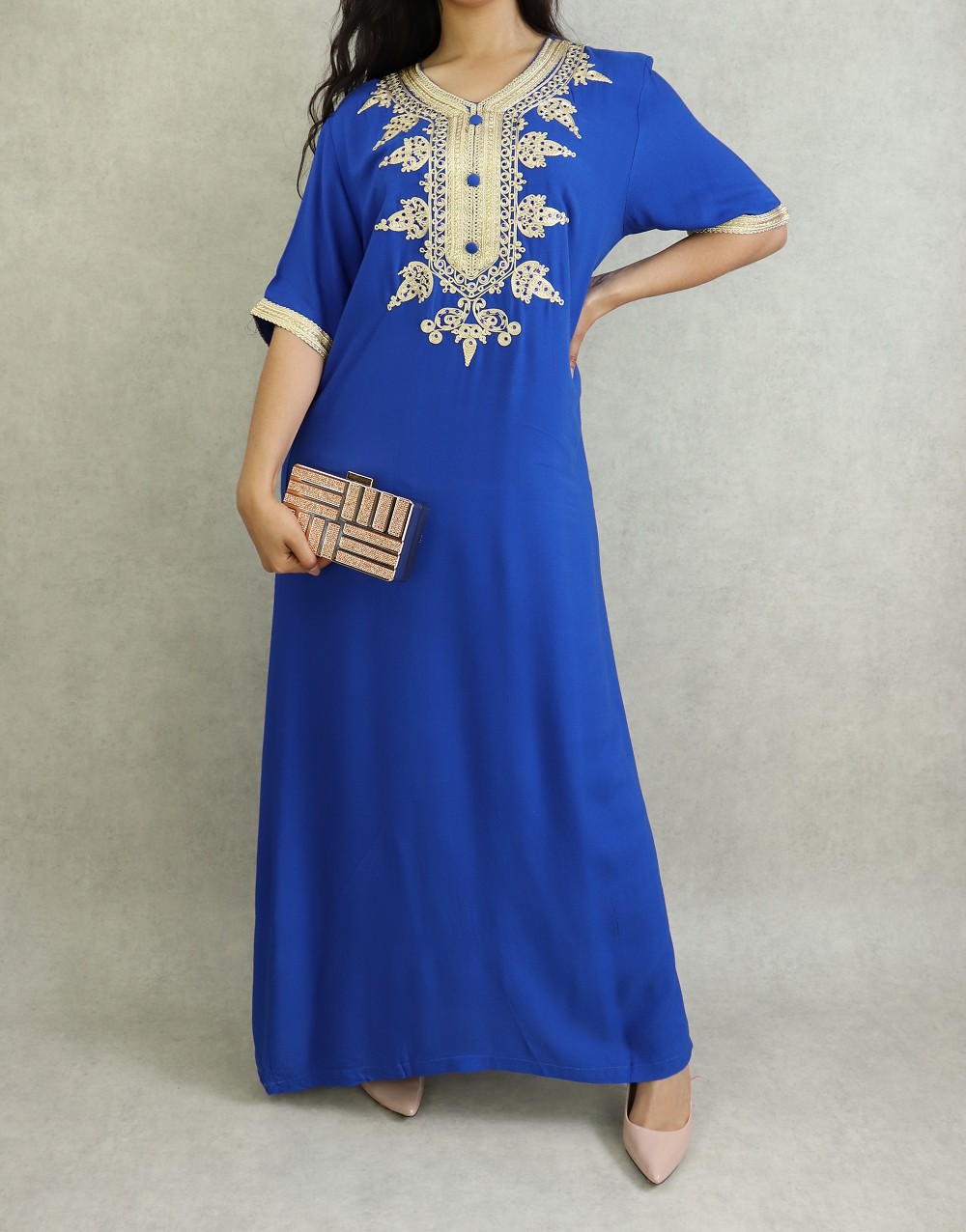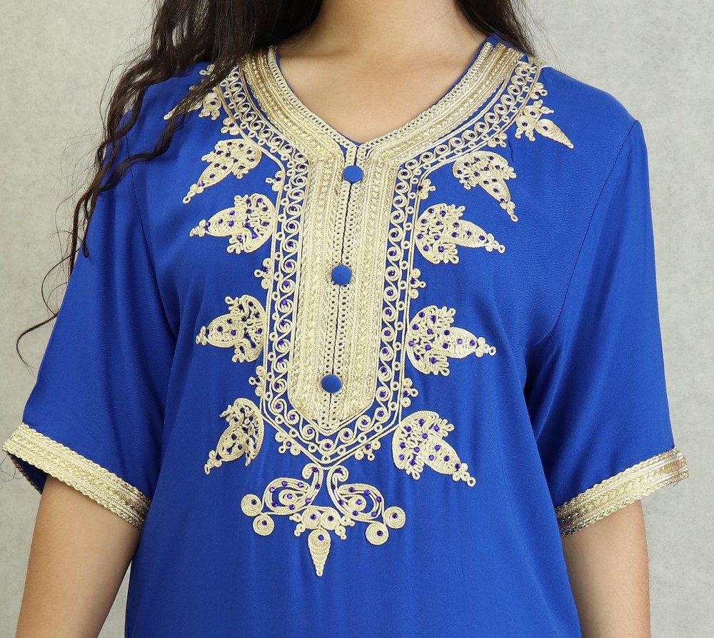 Très Belle robe algérienne. Robe longue manches courtes et broderies dorées sur le col et les manches, accompagnés de quelques strass.