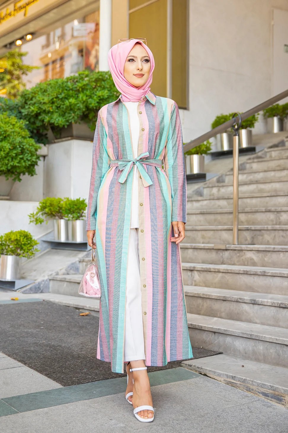 Robe très longue à rayures ceinture intégrée (Mode Musulmane) - Couleur Menthe - REF. 33883 (19.90 €)
