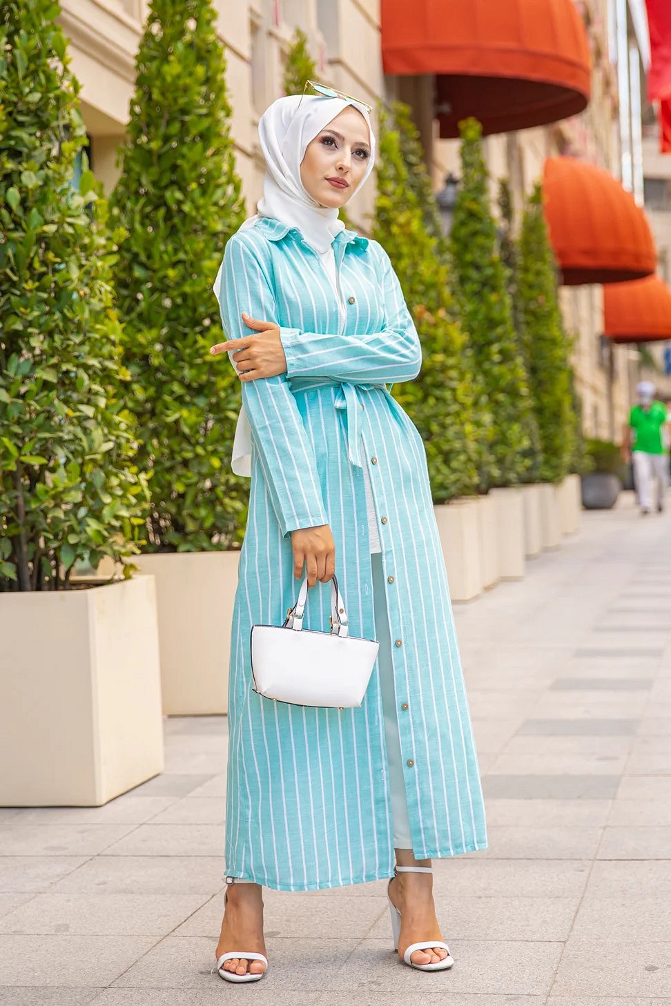 Robe chemise d'été longue à rayures (Vetement hijab chic pour femme) - Couleur blanc et bleu clair - REF. 32893 (25.00 €)