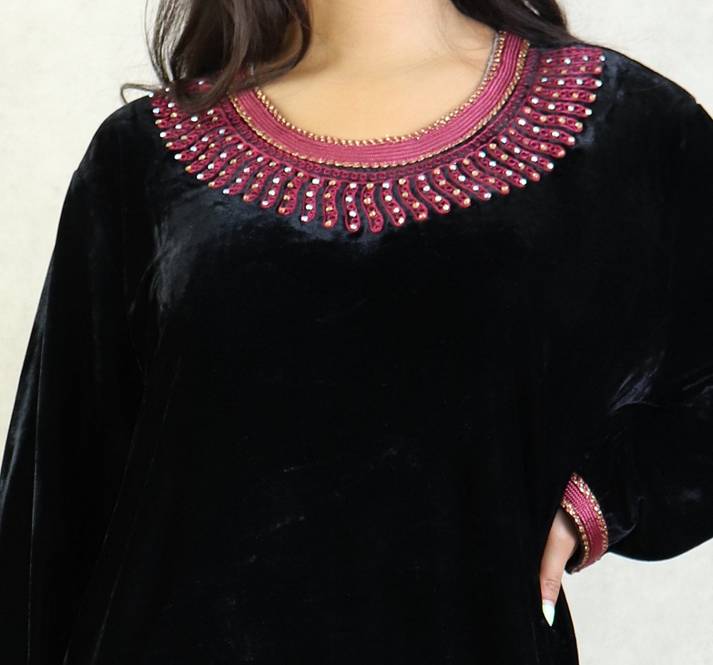 Cette robe aux manches longues brodée de motifs orientaux et strasse sur le col rond ainsi que sur la fente.