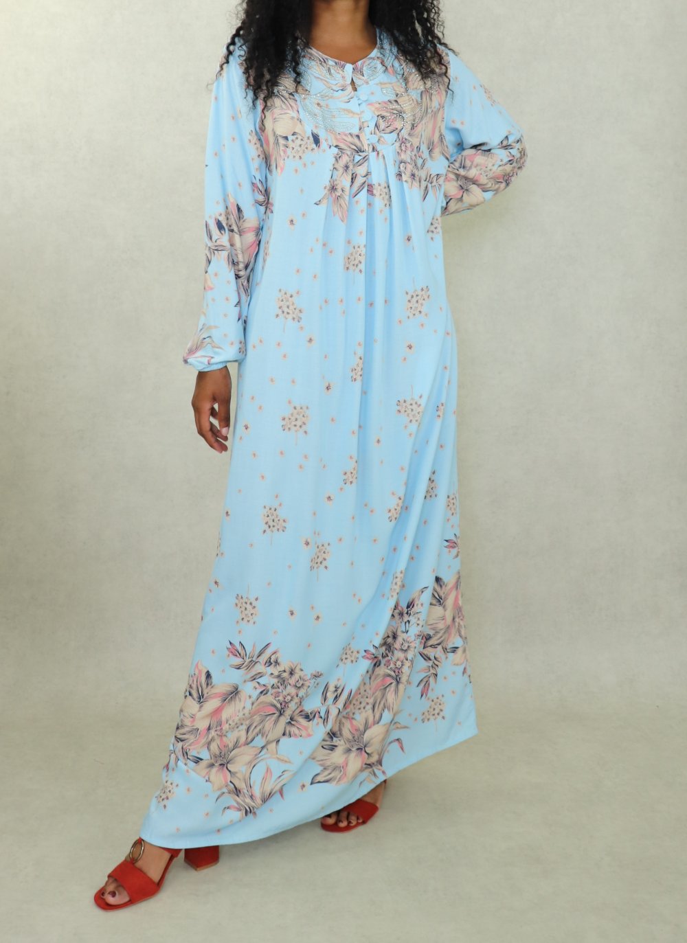Robe d’intérieur avec motifs à fleurs sur fond Vert d'eau. Col rond avec quelle que strasse et trois boutons décoratifs sur l'avant, manches longues finition élastiques aux poignets, elle est douce et agréable.