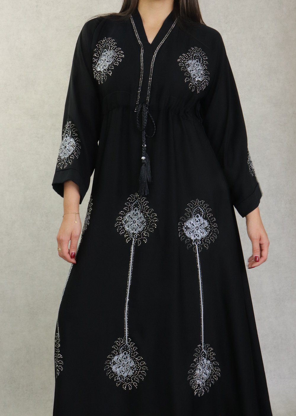 Robe Abaya Dubaï noire de qualité avec broderie et strass argenté et ceinture interne - REF. 38194 (45.00 €)