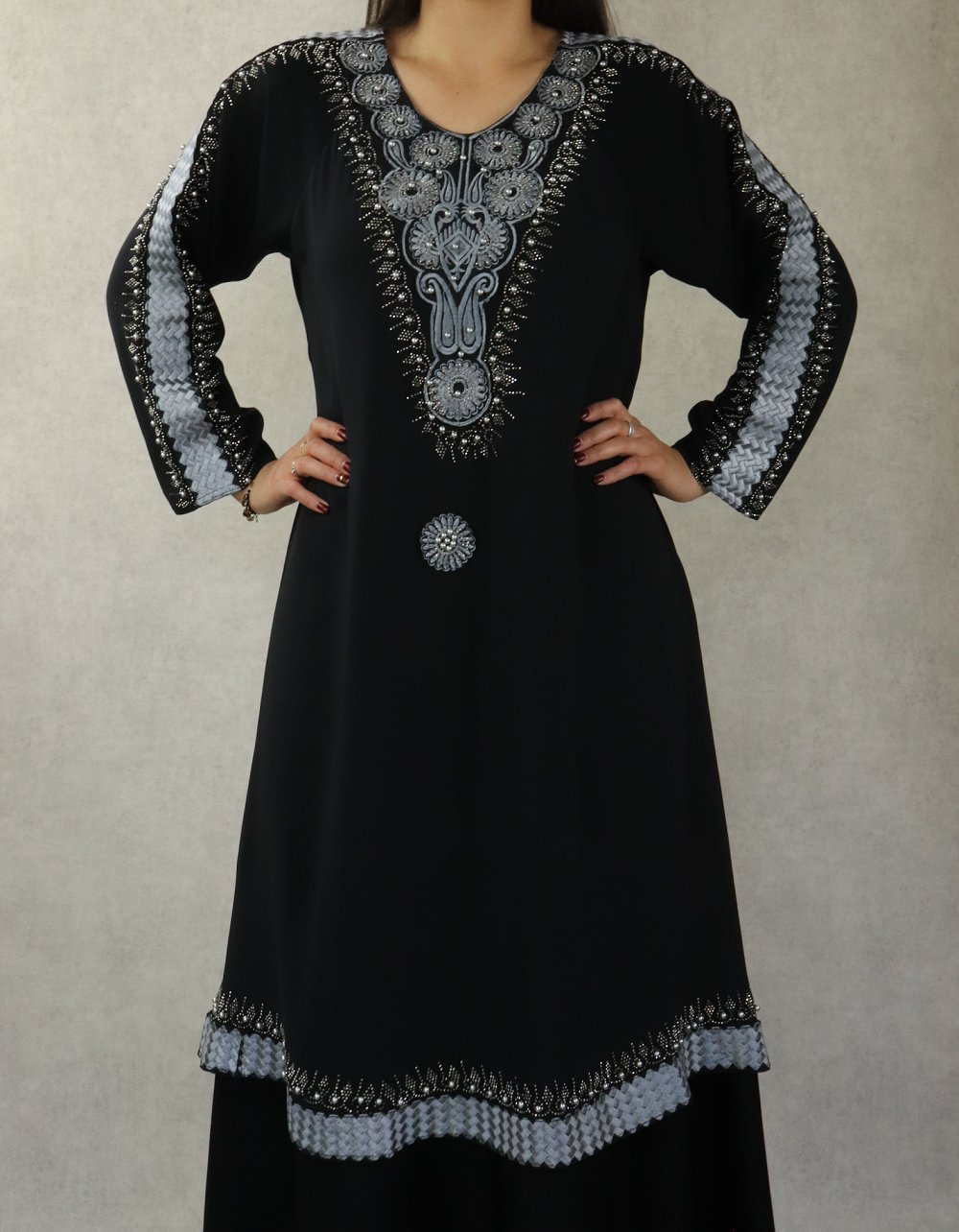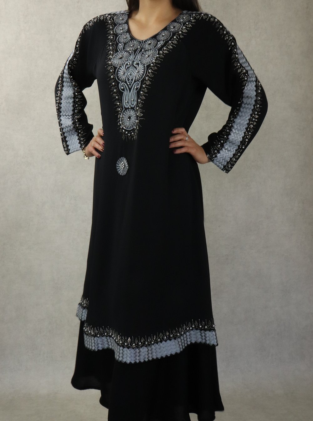 Très belle robe de soirée perlée de style Abaya Dubai de couleur noire avec broderies et strass argentés, fournie avec son châle assorti. La robe est doublée d'une partie brodée.