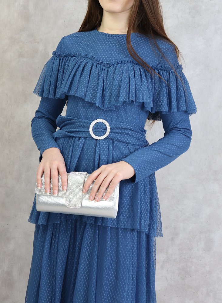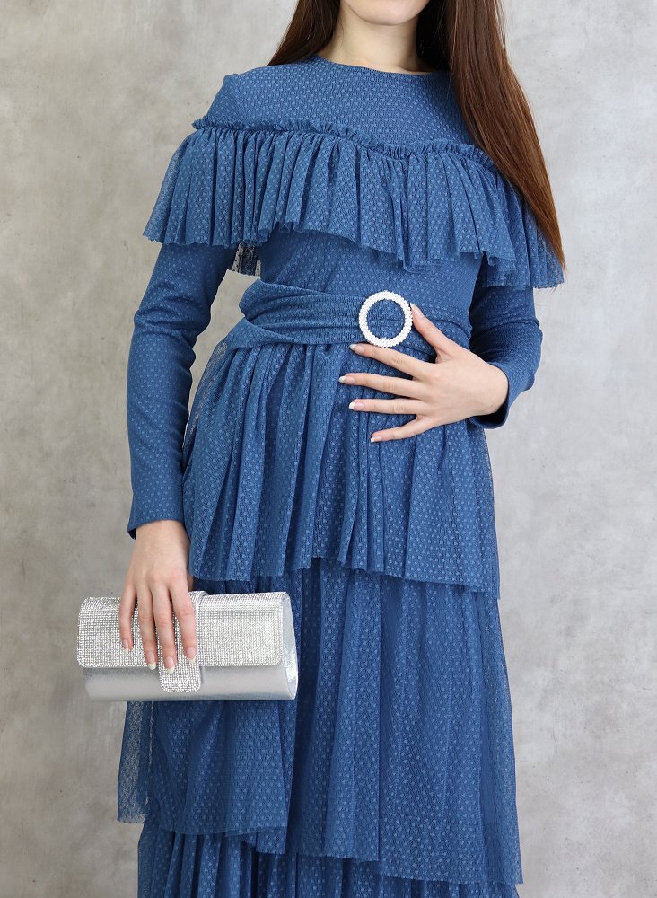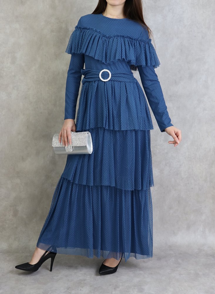 Robe longue, col rond, taille élastique, ceinture d'ornement en strass, fermeture glissière au dos, entièrement doublée, tissu extérieur effet tulle avec volants.