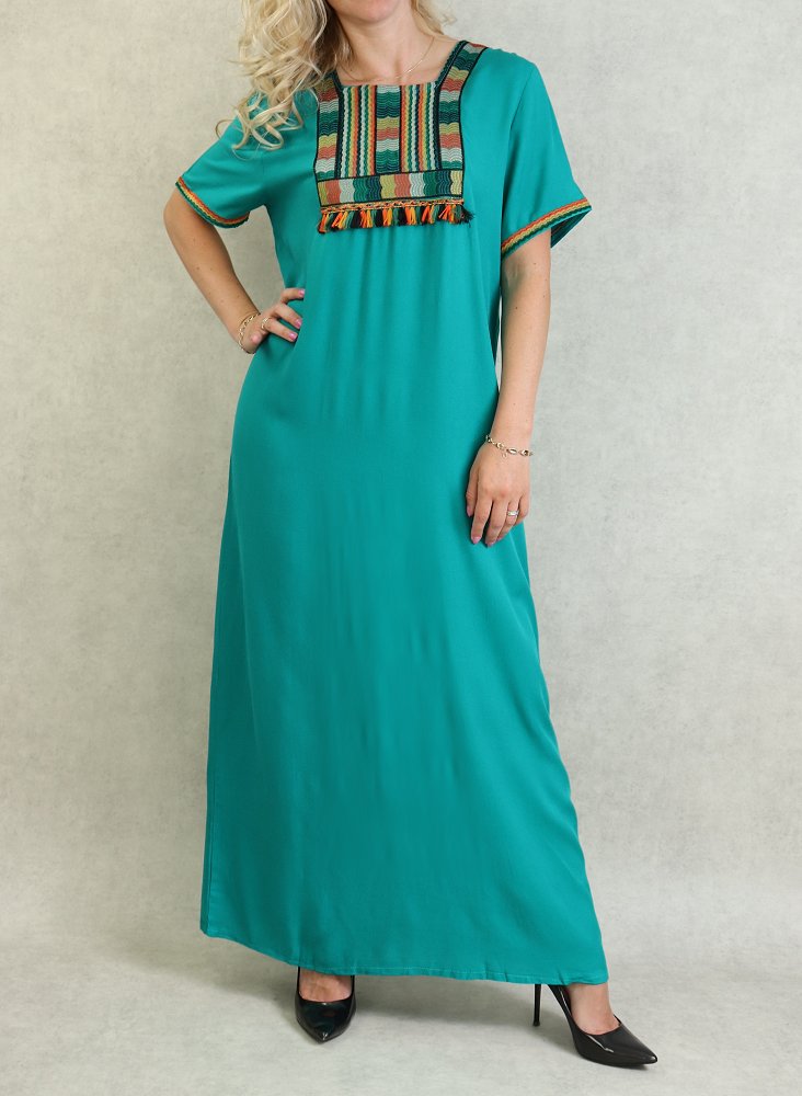 Robe longue manches courtes pour femme avec broderies originales, coupe droite, tissu fluide et doux au toucher coton.