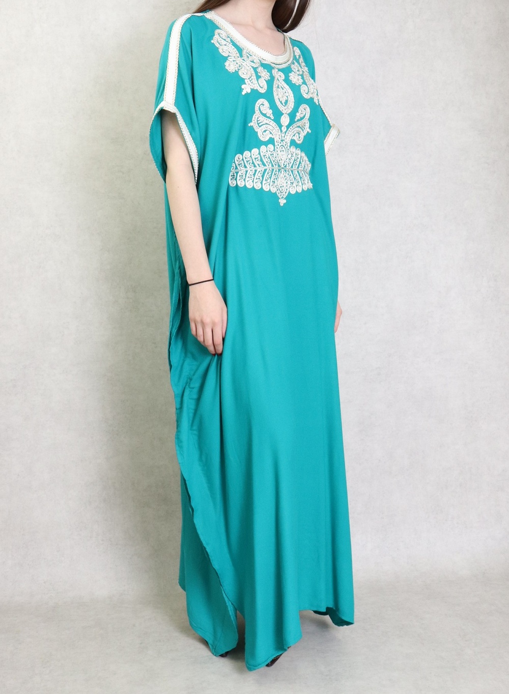 Robe longue, col rond, broderies à base de strasse et de perles sur le buste ainsi qu'à la taille. Coupe droite, tissu doux et fluide.