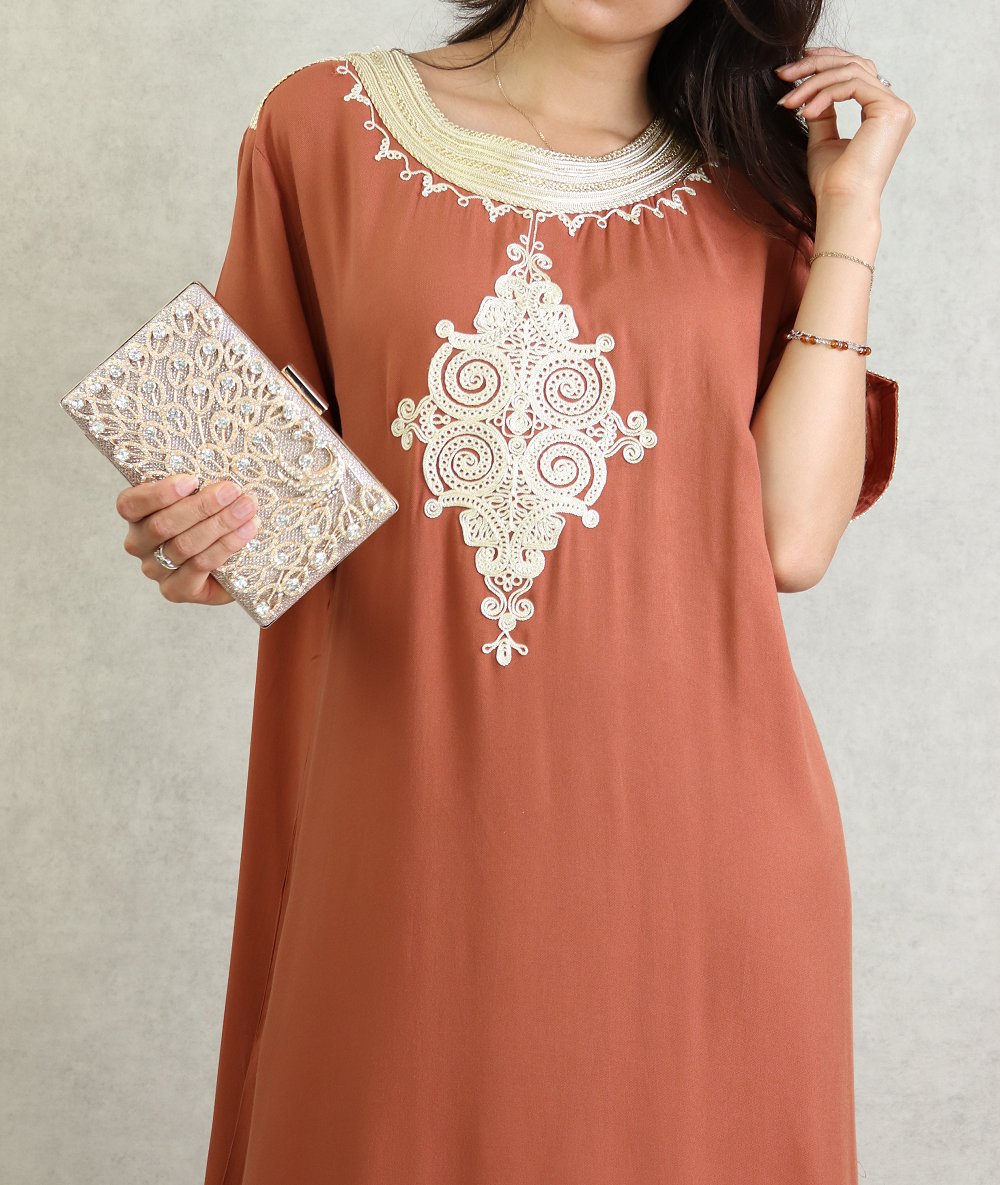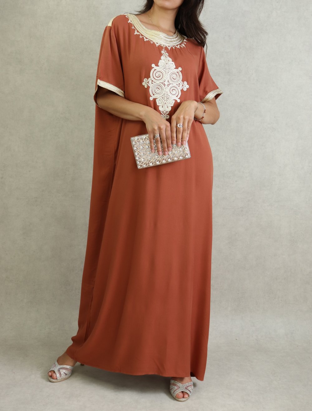 Une robe longue très confortable, manches courtes. Coupe droite avec nombreuses broderies. Matière fluide et agréable de type coton idéale pour la maison et la chaleur de l'été.