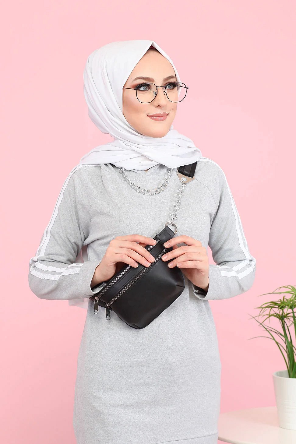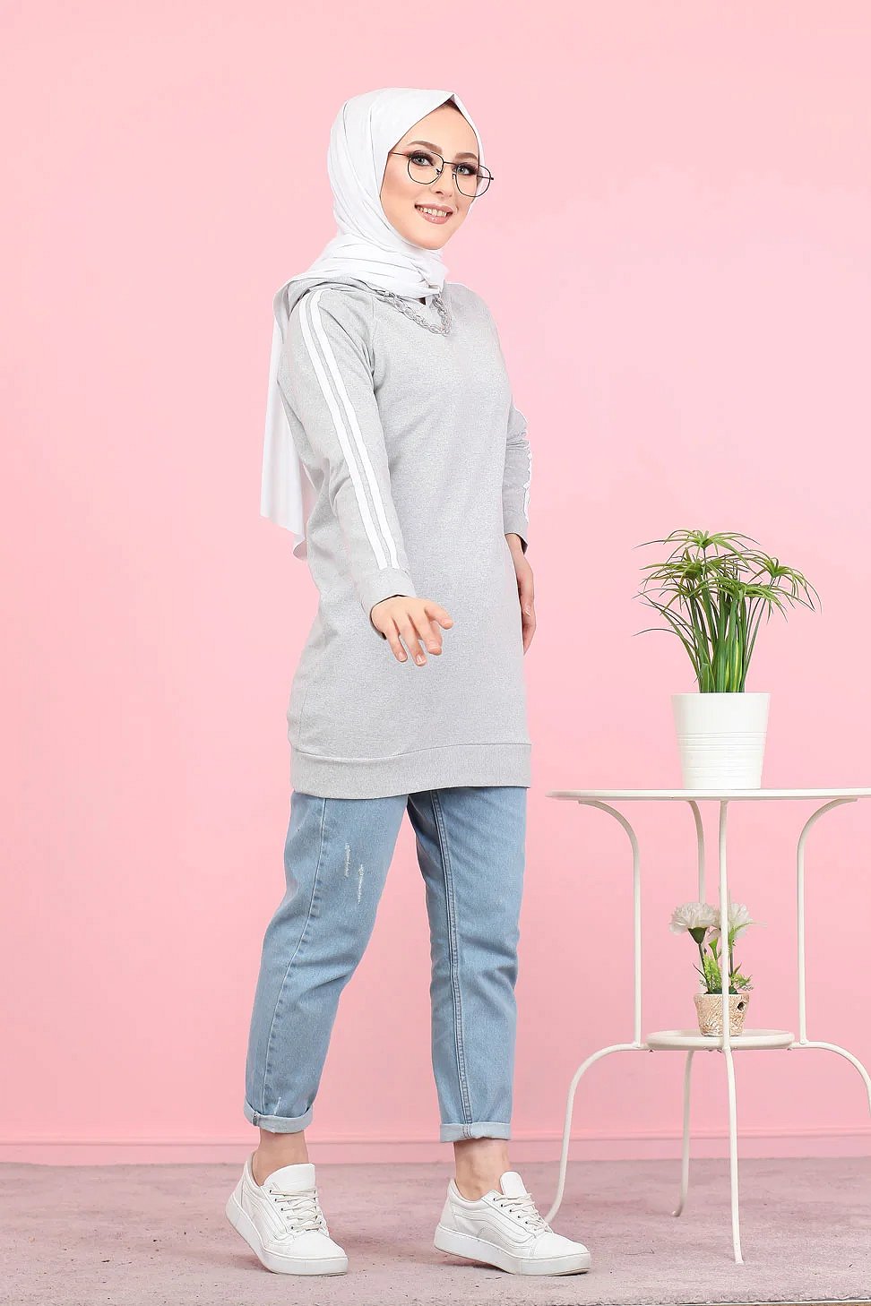 Sweat-shirt femme à capuche. Tunique décontractée et sport avec deux bandes blanches.