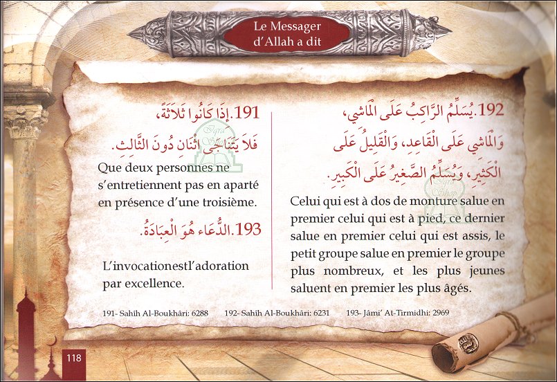 Chacun de nous sait que la religion repose musulmane repose sur deux fondements : Le Livre d’Allah et la Sunnah de Son Messager (PSDL). Notre noble Messager a dit : « Transmettez de ma part ne serait-ce qu’un verset ou un hadith. » Et il a dit : « Quiconque m’attribue délibérément ce que j’ai pas dit a mérité sa place en Enfer. »Par ces deux hadiths, chaque croyant se voit charger chacun selon ces capacités et la science religieuse dont il dispose de transmettre les hadiths du Messager d’Allah (PSDL).En outre, il doit obligatoirement s’assurer que les paroles du Prophètes (PSDL) qu’il transmet aux autres, musulmans ou non sont authentiques.Le but de la publication de cet ouvrage est de transmettre les paroles du Messager (PSDL) aux hommes et femmes et en particulier aux plus jeunes d’entre eux et ce, aux quatre coins de la terre. Cet ouvrage contient 200 hadiths, voici quelques titres :