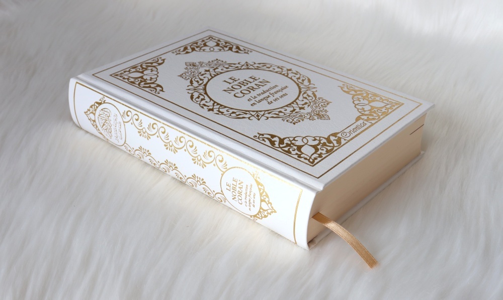 Avec index des sourates visible sur la tranche du livre permettant un accès plus rapide au début de chaque sourate. Pour les sourates longues, permet de connaître visuellement le nombre de pages qu'il nous reste à lire pour finir la sourate.