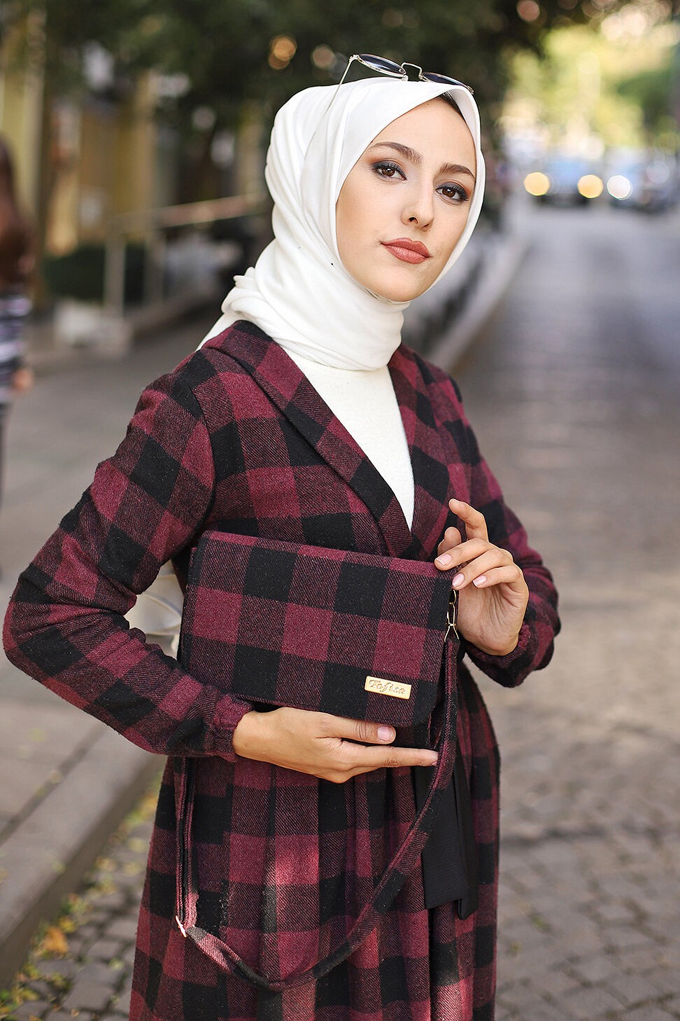 Ensemble Robe à carreaux avec sac à main assorti - Couleur rouge bordeaux et noir Vetement & Accessoire
