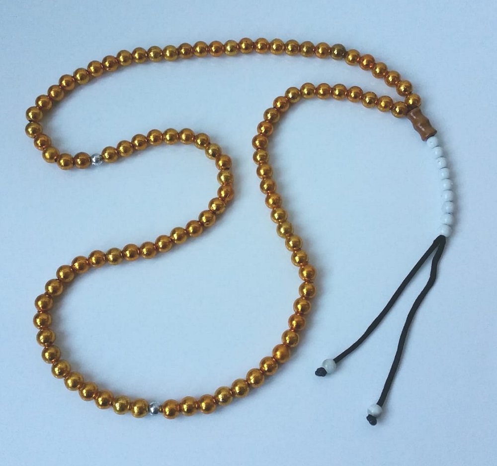 Chapelet à 99 perles dorées avec 2 séparateurs argentés et ponpon-compteur à billes blanches.