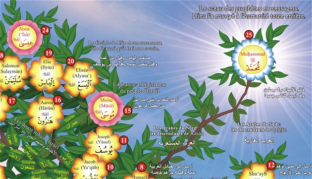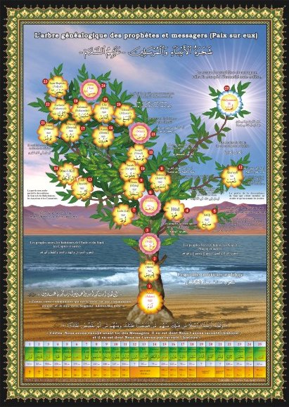 Ce magnifique poster en couleur regroupe tous les prophètes connus dans la tradition musulmane. On y distingue les 5 grands prophètes (Ouloul-'Azmi minal-Roussoul). L'ordre des prophètes est indiqué ainsi que les dates de leur vie.